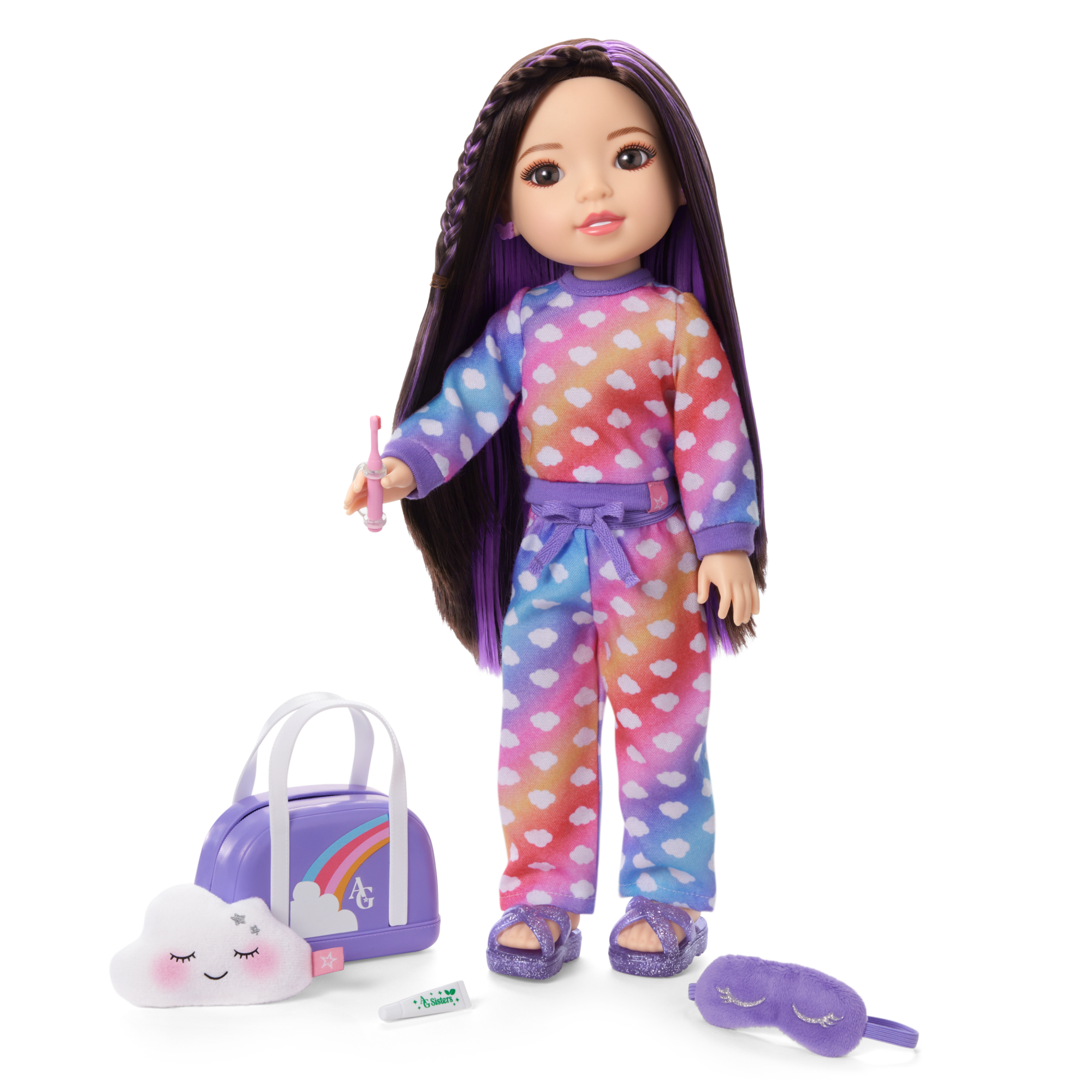 Cuddle up in this cute and cozy cloud-print PJ set that’s perfect for AG Sisters sleepovers! This 8-piece set of 14.5-inch doll pajamas with matching accessories is designed to fit the AG Sisters dolls (each sold separately).