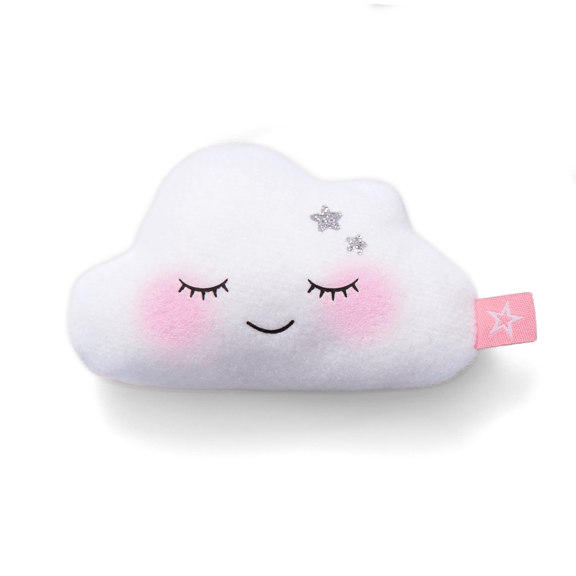 A white plush cloud pillow with a printed face, pink cheeks, and silver stars