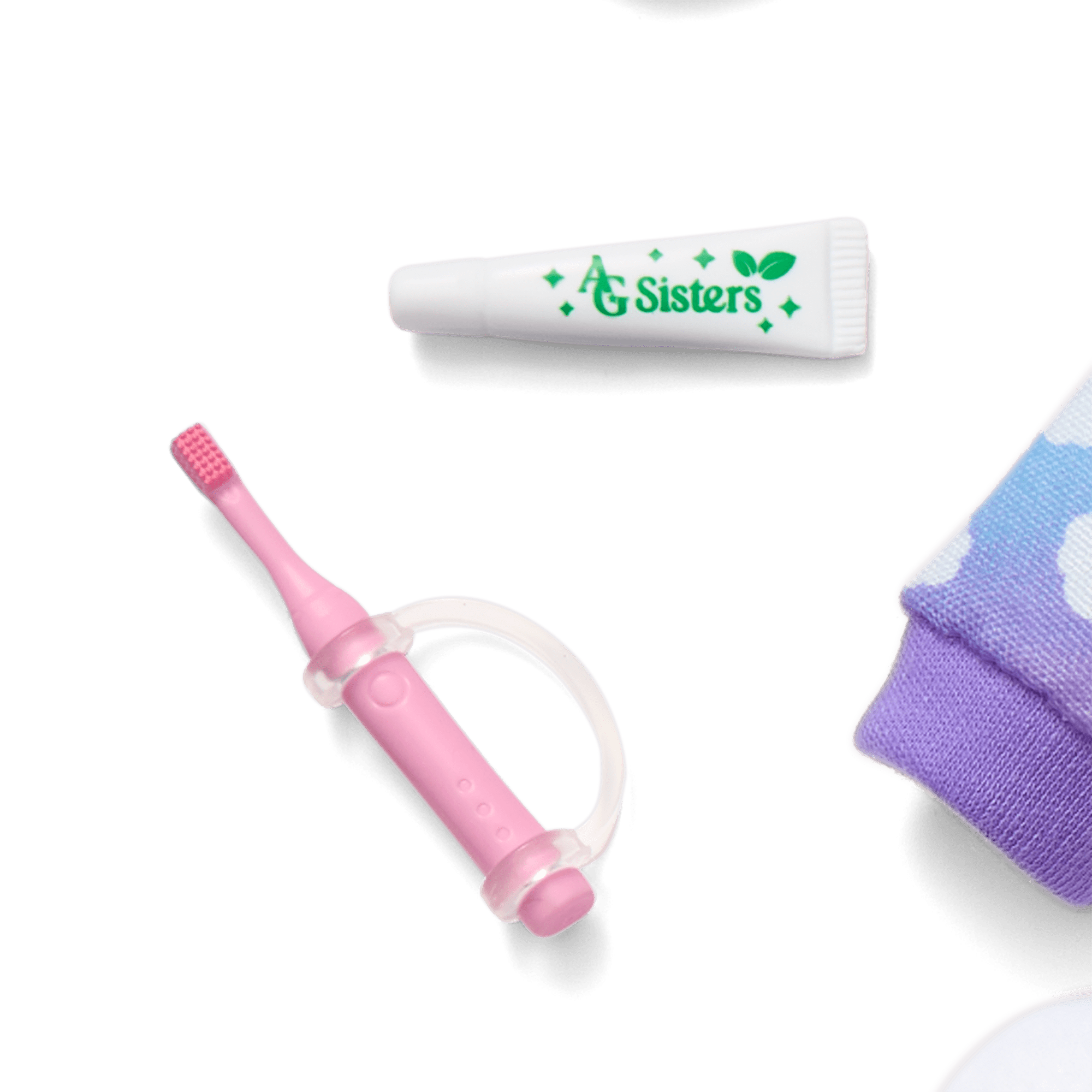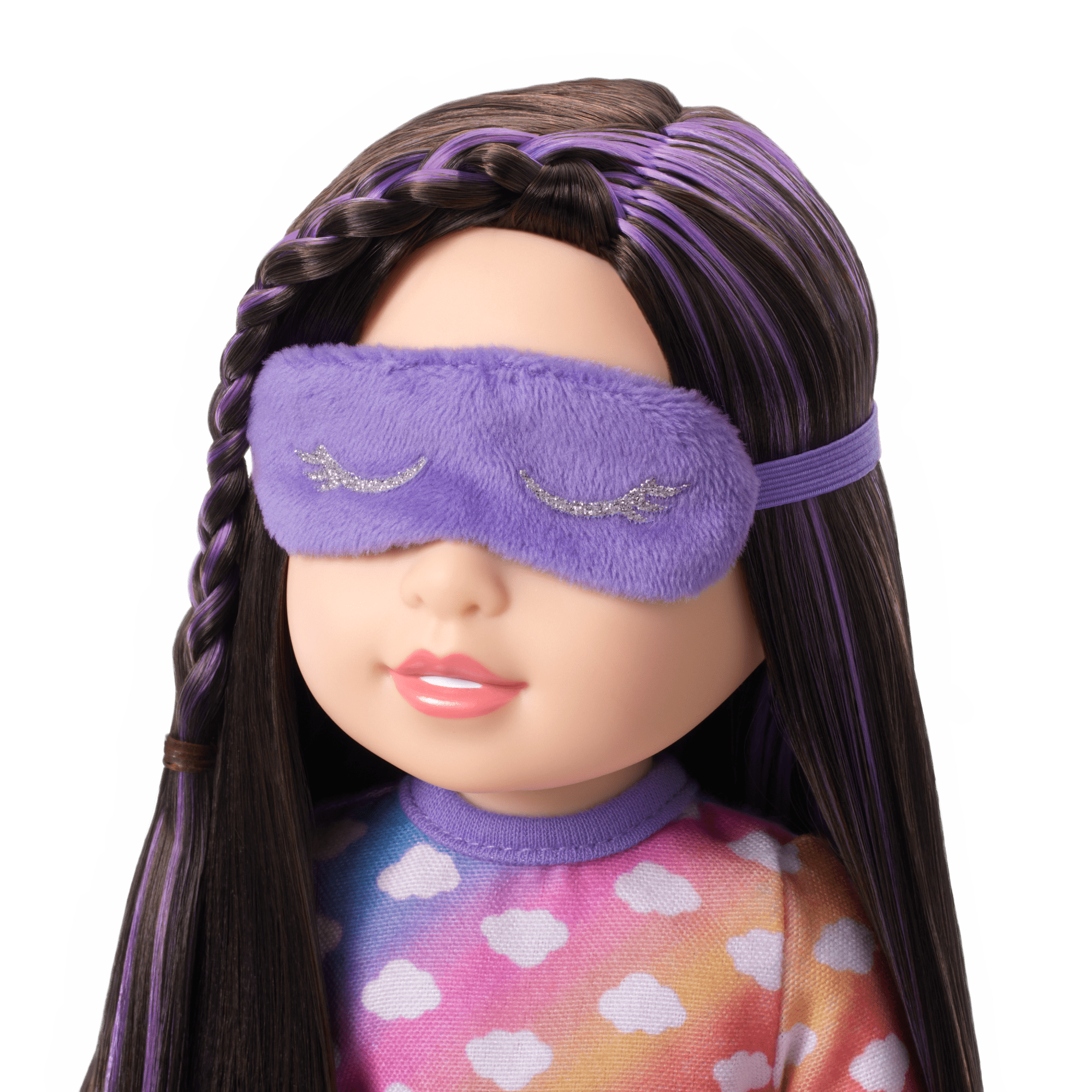 Sleepover essentials: a purple plush sleep mask with glittery eyelash details, a pink toothbrush dolls can hold, and a pretend toothpaste container