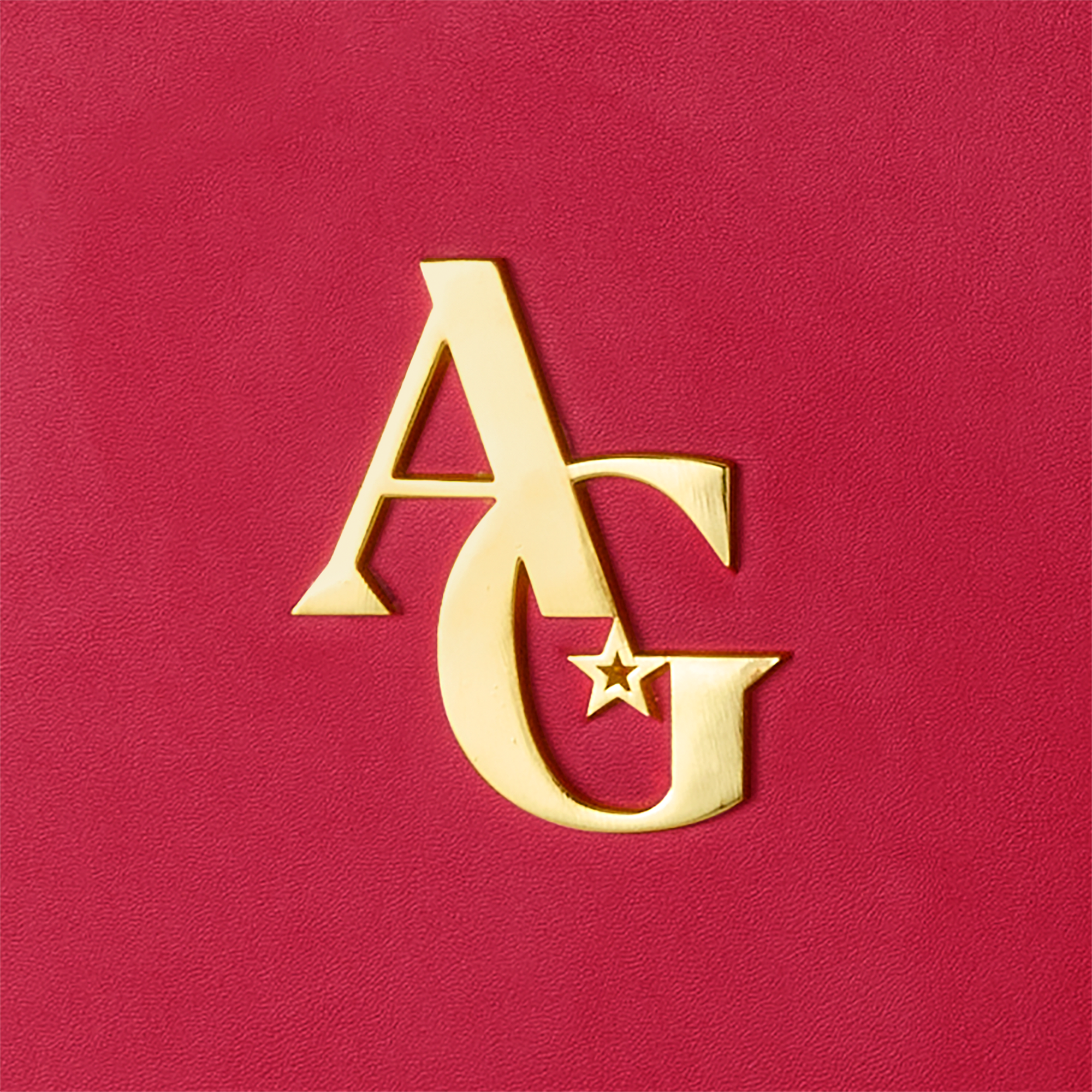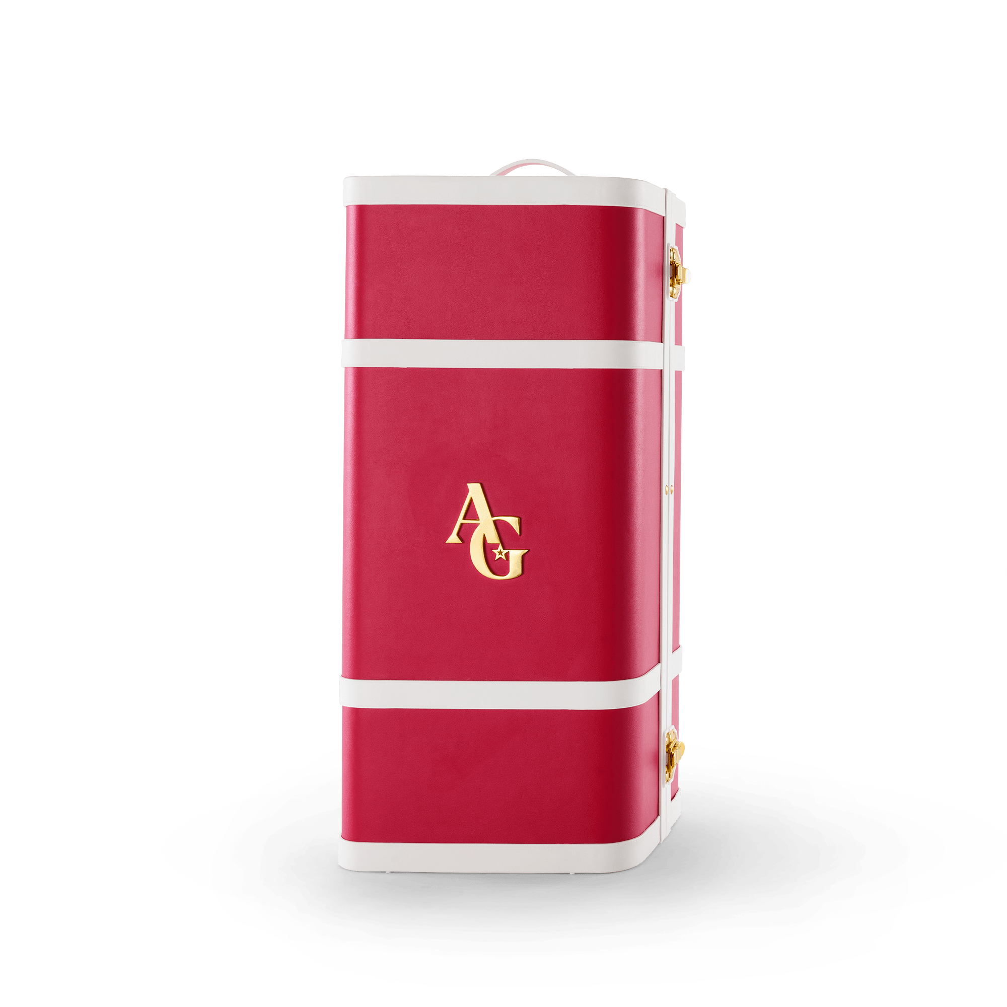 An AG signature berry-colored wardrobe trunk featuring white strapping details, a gold latch closure, a gold nameplate holder with a customizable name tag, and a gold AG logo badge on the exterior. The interior features a gold foil AG logo print and two-sided storage. One side features an open compartment for larger items-use the clothing rod and three hangers for storing outfits or secure a doll in place with the strap. The other side features three drawers to house accessories, plus a square mirror at the top for doll dress-up play.