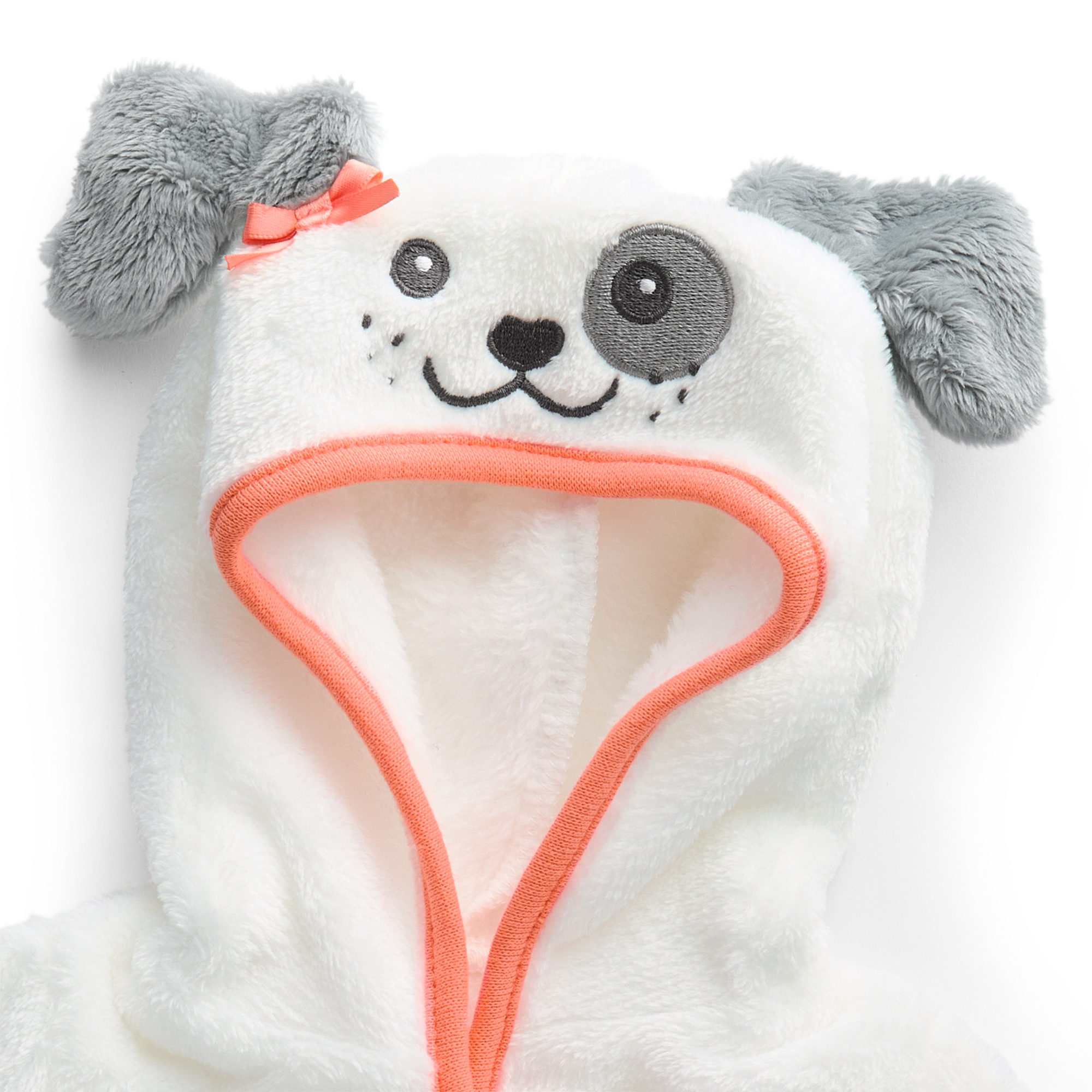A white plush hooded robe for girls with an embroidered puppy face, plush ears, a bow, and embroidered paw prints at the hem